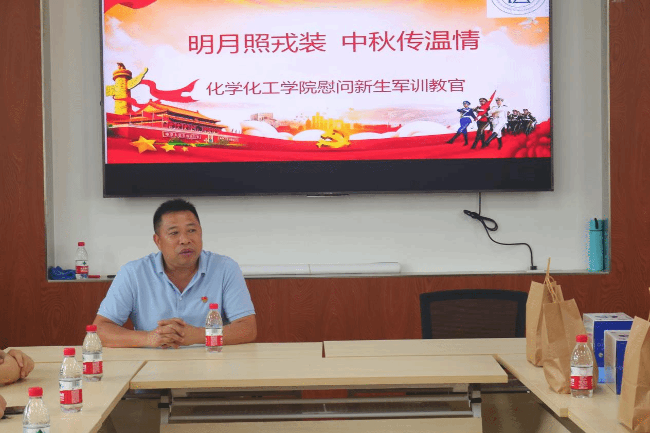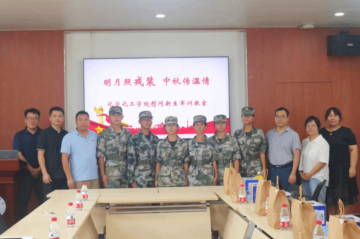 9月14日,“明月照戎装 中秋传温情”,今年会官方网站在何鸿燊楼A座403党建活动室开展军训教官传统佳节慰问活动,今年会官方网站党委书记邱树华,院长舒绪刚,党委副书记刘勇,辅导员刘亚宁、李珊珊、袁海儒到场开展慰问,承担化工学院新生军训任务的方海燕、卢梓航、朱倩怡、杨明慧四位同志和承担其他营队军训的苏妍淳、邹鑫涛六名学生军训教官代表参加活动。