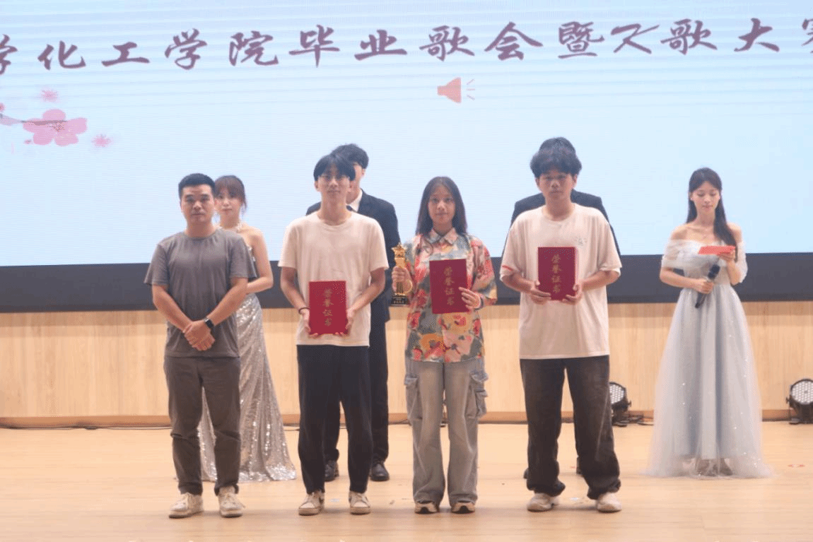 获得十佳歌手称号的有种科 211 祝浩航、食品国际 241 刘柯妍、国贸 241 洪东骏、工管 231 薛泽振、园林 231 陈畅航、人力 241 曾雅琦、商英 231 黄祖怡以上七位同学,黄铎为以上同学颁奖;获得化工院音乐之星的是化工 241 的杜蕊莹,获得化工院优秀歌手的是化工 231 杨业成和材化 241 林浩彭,许义锋为以上三位同学颁奖。