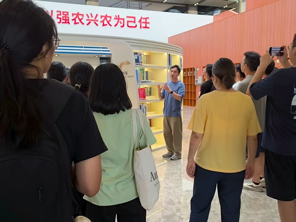 9号下午,助班组织新生在图书馆集合,图书馆办公室主任李建彬带领新生进行实地导览。他详细介绍了图书馆各功能区域的划分、布局及使用规则,并深入解读了图书馆的设计理念——充分融入学校农业特色,凸显“以强农兴农为己任”的办学定位,让新生对图书馆有了全面且深刻的认识。