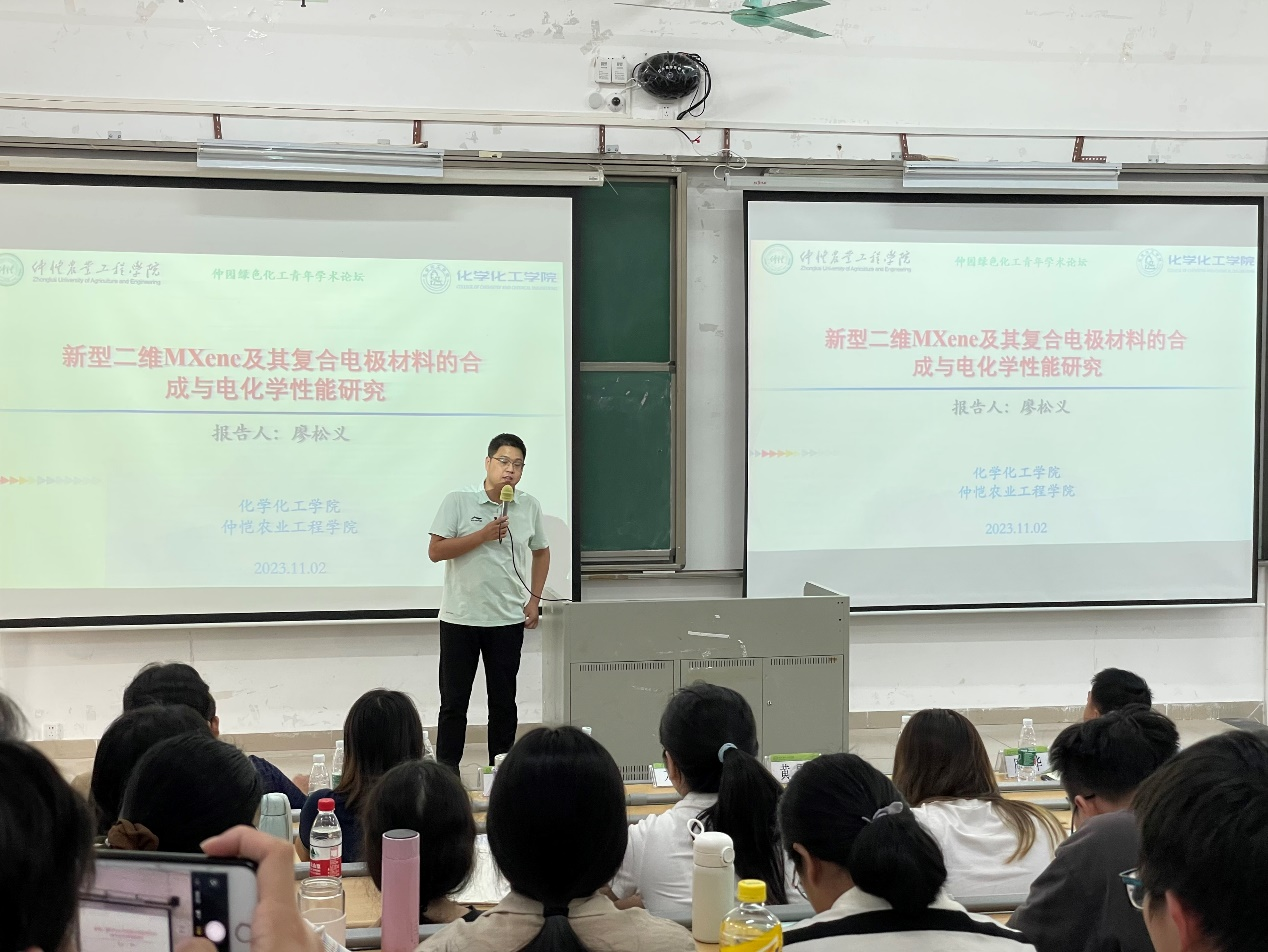 郝丽副教授报告题目为《氮化硼纳米片缓释体系构建及其性能研究》、廖松义特聘副教授报告题目为《新型二维MXene及其复合电极材料的合成与电化学性能研究》、曾黎燕特聘副教授报告题目为《功能性食品保鲜剂的设计、合成及其应用》。三位老师分别从各自研究课题的研究背景与意义、研究内容与进展及重要研究成果等方面做了精彩分享,并与现场师生进行深入了交流和探讨。