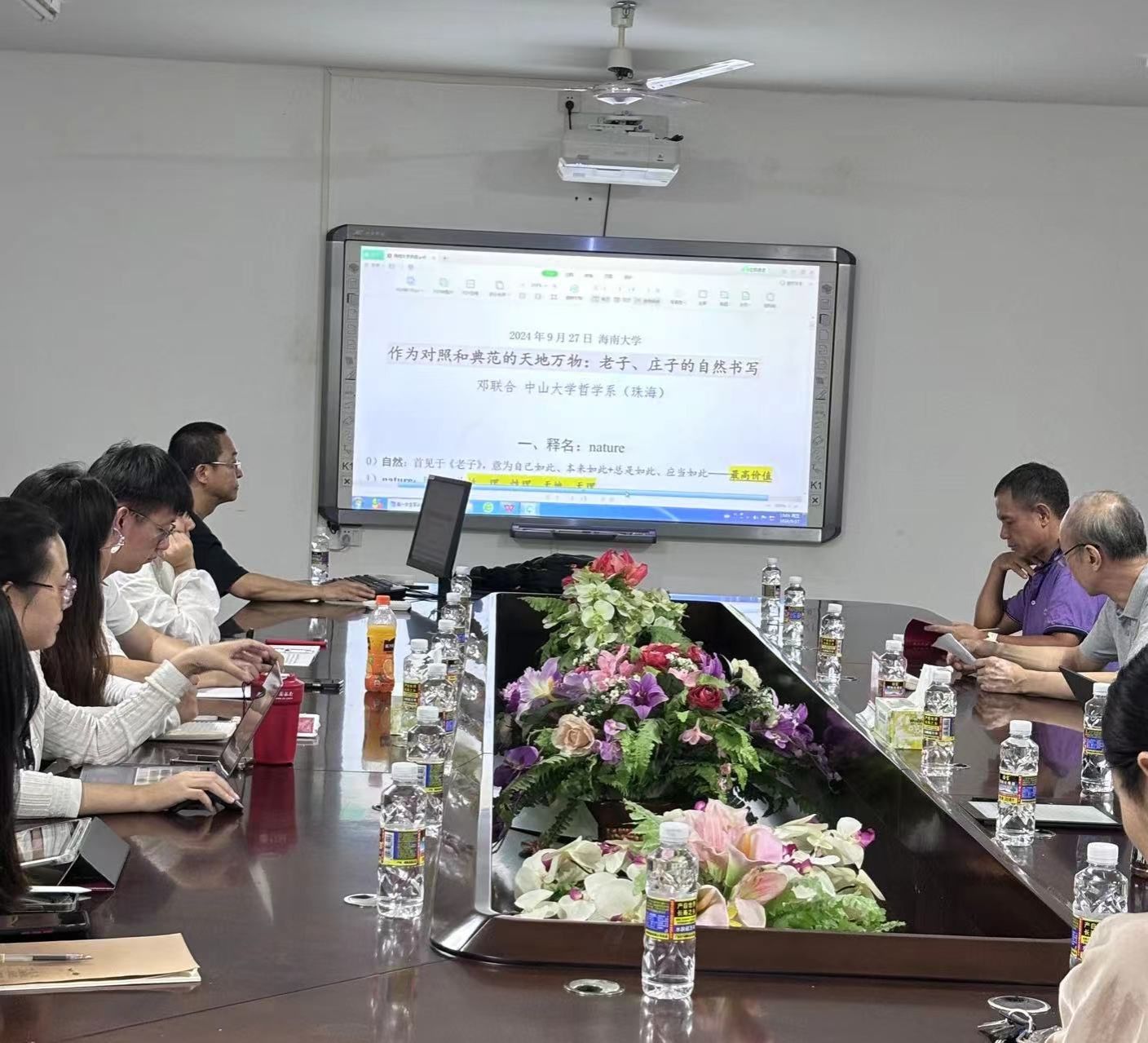 2024年9月27日晚19:00,jinnian金年会邀请中山大学哲学系(珠海)邓联合教授在社科楼A311会议室为学院师生作“作为对照和典范的天地万物——老子、庄子的自然书写”专题讲座。讲座由jinnian金年会黄启祥教授主持,学院部分教师、本硕博学生参加了本次讲座。