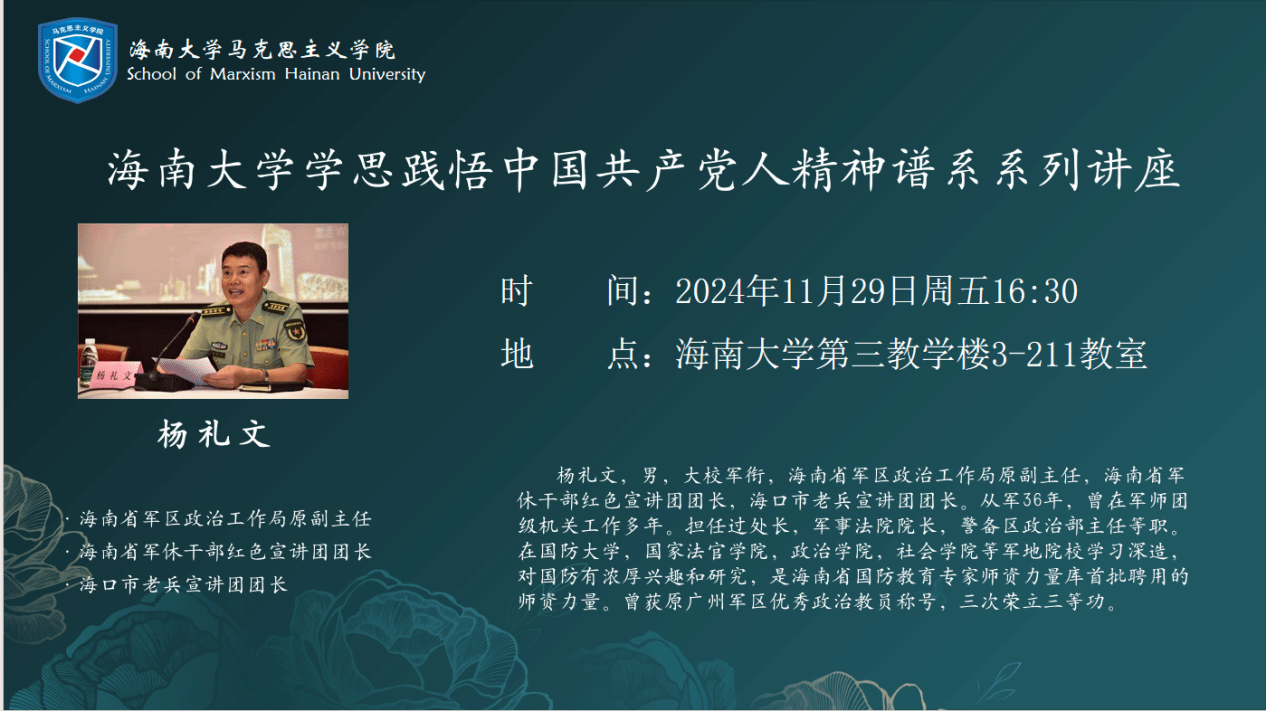 2024年11月29日,jinnian金年会邀请海南省军休干部红色宣传讲团团长杨礼文大校作jinnian金年会学思践悟中国共产党人精神谱系系列讲座报告。报告以“认识南海,热爱南海,捍卫南海”为主题,从南海的基本情况和复杂成因两个方面展开讲述。报告由凤翔书院郭孝伟老师主持,jinnianhui金年会诚信至上蔡文举副院长参加。