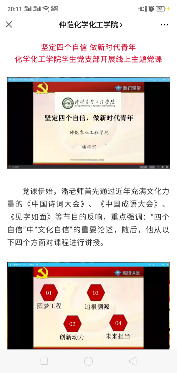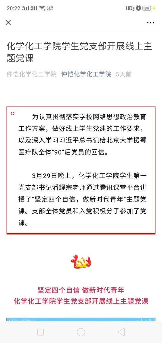 学生党支部开展主题为“坚定四个自信,做新时代青年”的线上党课教育活动。疫情是一面照妖镜,面对汹涌的疫情,西方所谓的民主制度和中国大陆集中力量办大事的特色社会主义制度;西方的双重标准和中国文化中滴水之恩涌泉相报的人性光辉;“群体免疫”与“始终把人民健康和生命安全放在第一位”“应收尽收”的大爱情怀,通过对比,自然而地更加深化和坚定了当代大学生的“四个自信”。