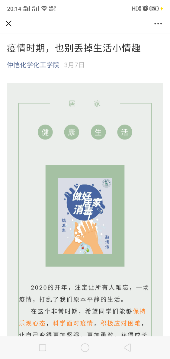 我们所学专业有什么作用?抗疫期间,我们用专业知识给学生上来一堂科普课。学院实验室教师运用专业知识,撰写了“jinnianhui今年会消毒指南”,普及消毒剂科普知识,帮助大家规范使用消毒液。另外,我们所学专业在防护服涂层、护目镜防雾等方面均可以发展重要作用,由此坚定学好专业的动力和信心。