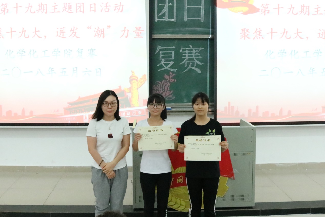 历史新起点,伟大新征程。复赛开始前在座全体师生起立奏唱团歌,接着屏幕播放了各个班的团员心声的视频。每个视频都展现出了优秀团员们有理想,有能力以及有担当的的风采。播放心声视频的环节结束后,比赛正式开始。本次比赛由各班团支部进行PPT演讲、班级表演及班级视频播放,最终评委团会根据各班级的表现进行评分。最先上场的是高分子173,他们以手语表演舞台剧,展示了团支部的风采。随后,应化173、高分子163分别带来深情激昂的朗诵,表现出对未来的浓厚期待与祝福。