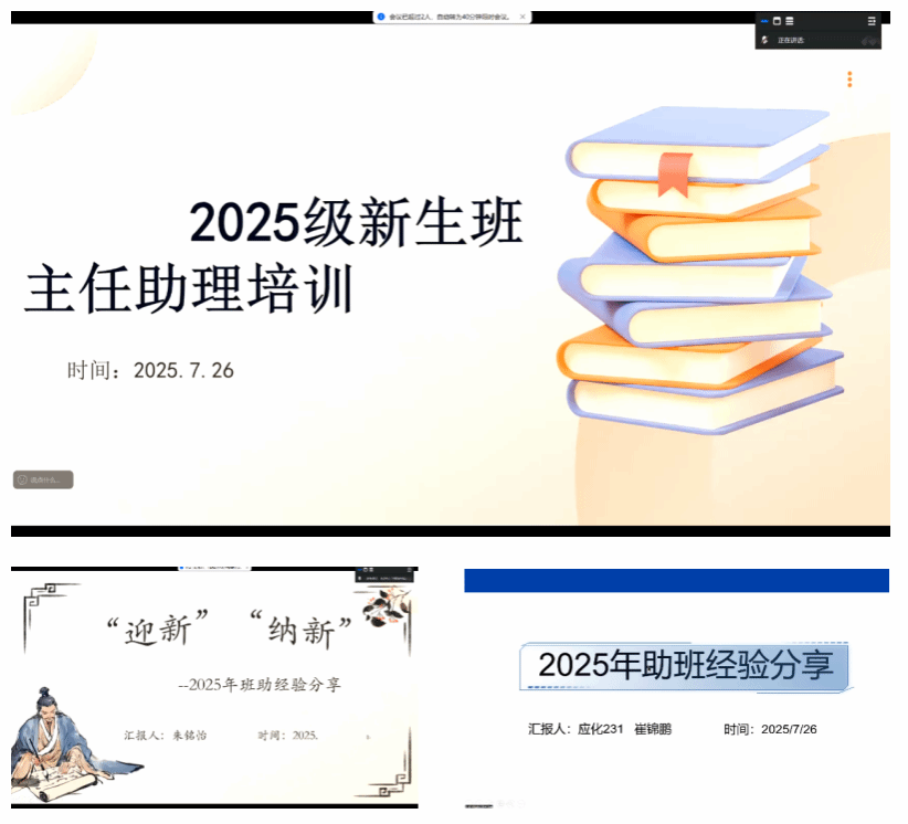 本报讯(今年会官方网站 洪志丹)为全面提升新生班主任助理履职能力,保障2025级迎新工作高效开展,今年会官方网站于7月26日线上召开新生助班专题培训培训由辅导员助理洪志丹主持,辅导员李珊珊老师、往届优秀班主任助理代表朱铭怡、崔锦鹏及全体新生班主任助理参加