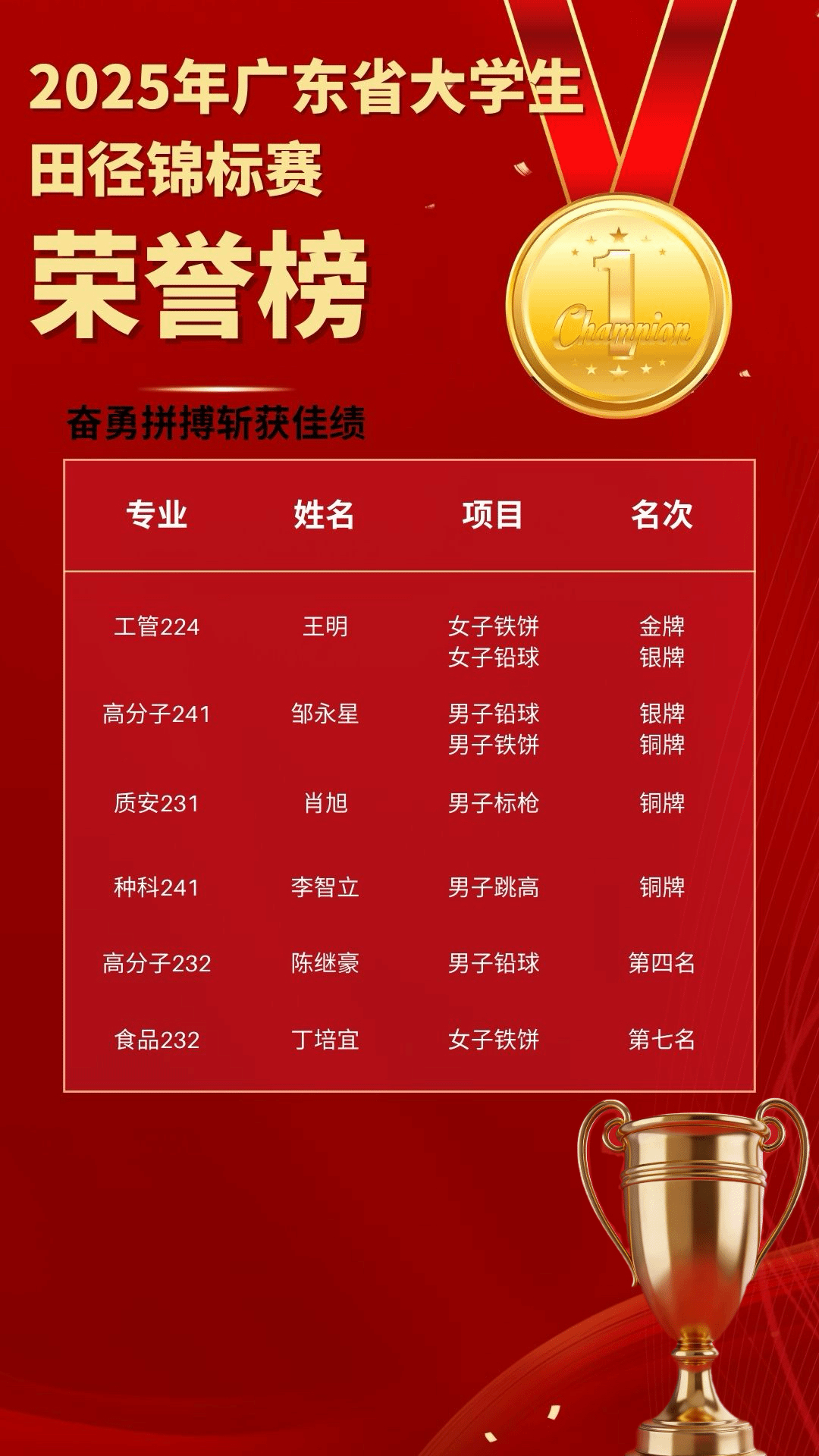 12月26~28日,由广东省教育厅主办,华南理工大学承办的广东省2025年大学生田径锦标赛于在华南理工大学(五山校区)举行,吸引了全省130所高校2334多名运动员及教练员参加比赛。今年会田径队10名学生运动员,在领队李尚胥院长、教练员林锋和钟进聪的带领下,参加了本次比赛。