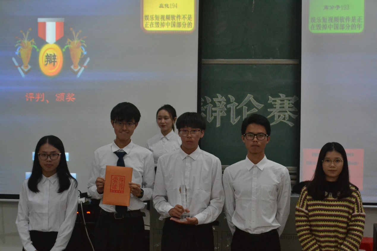 经过短暂休息后,高分子材料与工程193班和应用化学194班将进行冠亚军的角逐。辩题是娱乐短视频软件是否正在毁掉中国部分的年轻人,正方是高分子材料与工程193班,反方是应用化学194班。正方辩手认同娱乐短视频虽然有积极反馈、调节压力的作用,但是不排除部分视频中存在低俗内容、不良信息等诱惑影响、产生思想上误导易形成扭曲价值观等论点来立论。反方辩手则认为“毁掉”一词陈词严重,并通过列数字,举例子等方式阐述他方观点。双方都将自己的观点一一罗列出来,充分展示出了辩论双方的逻辑条理性与临场应变能力。最终,获得本次辩论赛的冠军班级是应用化学194班,亚军班级是高分子材料与工程193班,季军为应用化学191班,其中应用化学193班获得最佳组织奖,应用化学194班的第三辩手刘宇航获得了最佳辩手奖。