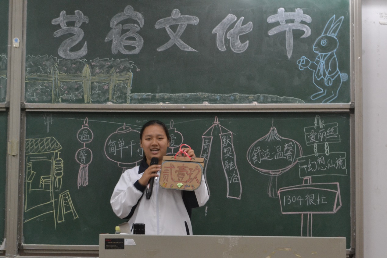本次艺宿文化节首先是各宿舍代表通过PPT以及自制的手工艺品来展示各宿舍风采。其中,1-522的宿舍代表以风趣幽默的讲解吸引了现场观众的眼球,她们的宿舍手工品充分体现了她们是一个友爱的集体。在1-316宿舍的宿舍展示中,海报上各具特色的卡通人物、饱含感染力的视频,无不令在场观众羡慕,更是赢得了在场观众的极力赞赏。1-304、1-219、1-218、1-322、16-3019宿舍的宿舍风采以及手工品的展示也各有特点,各有精彩之处,赢得了在场观众热烈的掌声。