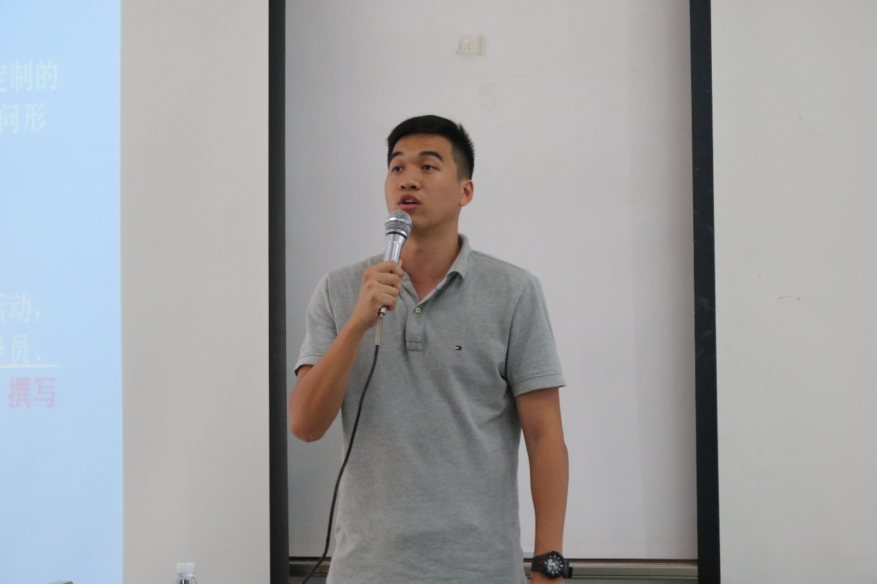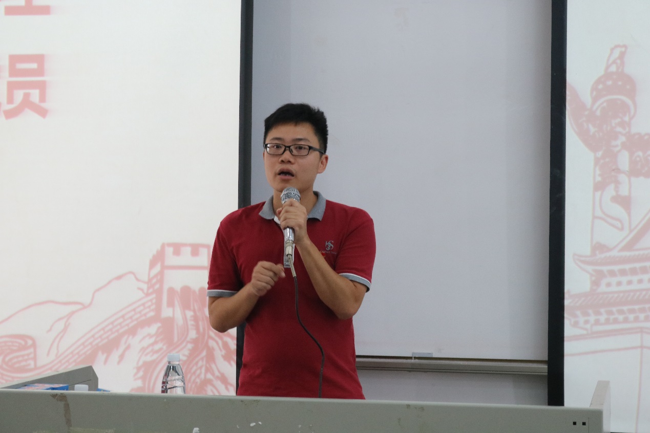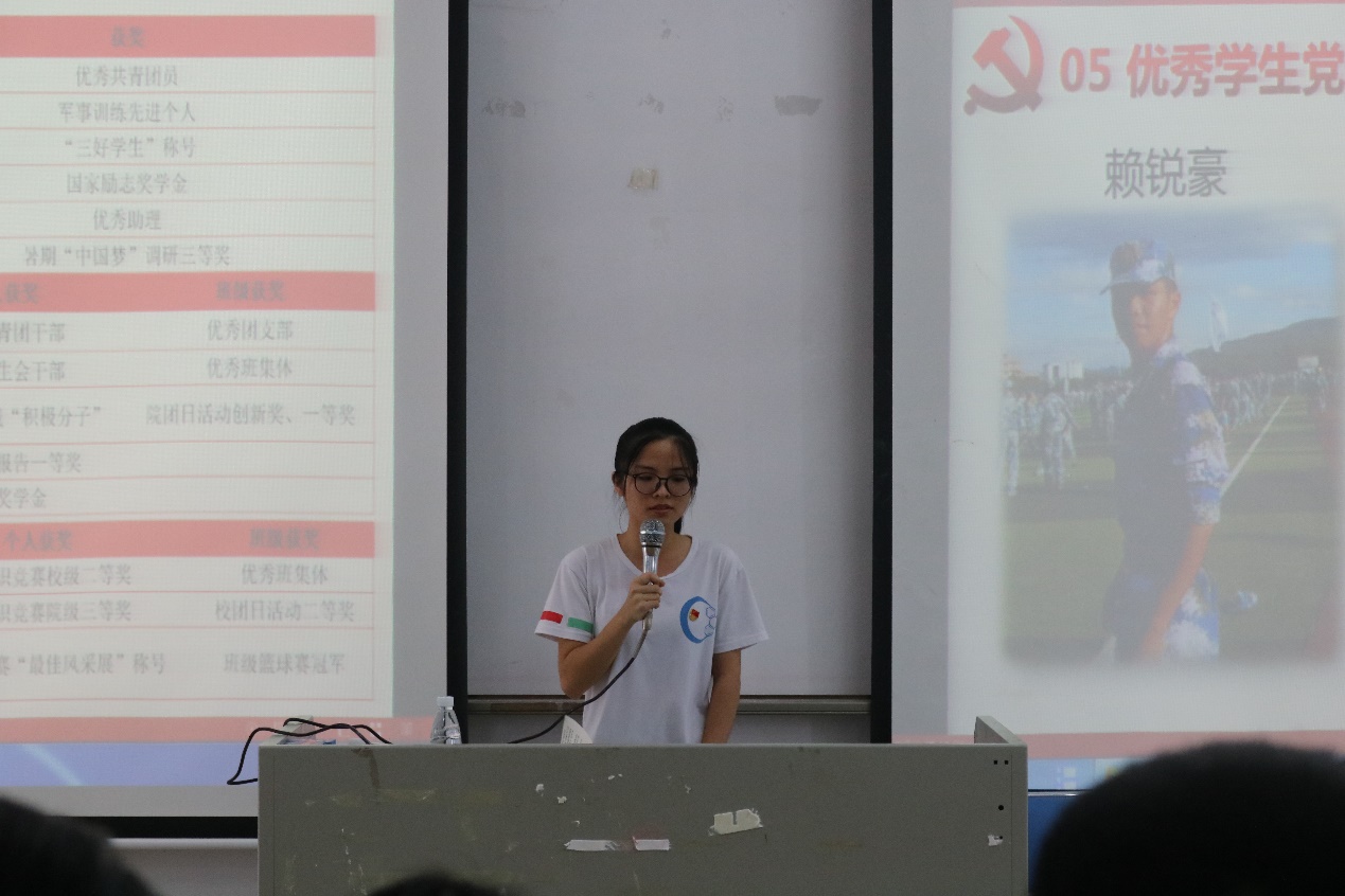我院第一党支部组织委员黄玉婵用六大部分向新生们介绍我院的党总支部:一、党的性质、宗旨以及指导思想;二、让新生了解入党誓词;三、我院党总支部的结构组成;四、我院党支部的丰富活动;五、我院优秀学生党员的情况;六、发展党员的具体流程。除此之外,她还播放了让人热血沸腾的爱国教育视频,新生不仅深入了解我院党总支部的情况,更激发了他们的爱国热情。