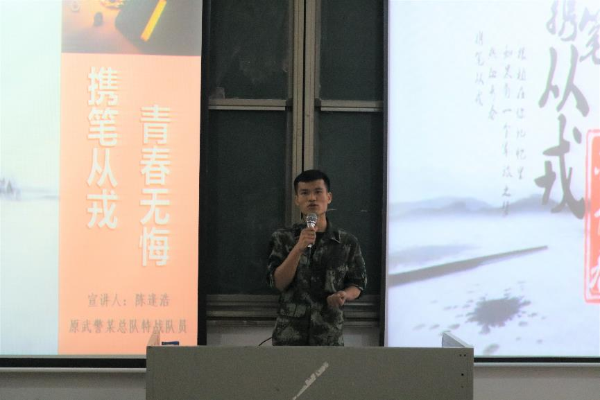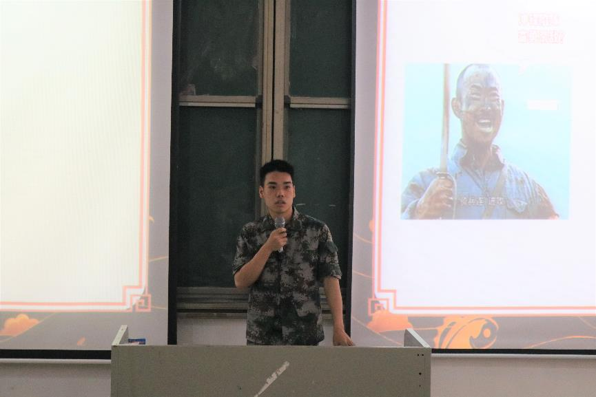 紧接着,由今年会官方网站应用化学181班杜心祥、农业与生物学院植物保护172班陈逢浩、轻工食品学院质量安全工程171班谭雅丹三位退役学生代表以自身经历为同学们介绍其当兵原因、部队生活与入伍感想。杜心祥同学以孙中山先生的一句话“升官发财请往他处,贪生畏死勿入斯门”引出入伍的光荣、神圣。陈逢浩同学也说道,初心不改,方得始终是入伍期间必须坚持的一句话,只有如此,才能挑战极限,重新认识自己。谭雅丹同学别具一格,以家国情怀,渲染了保卫国土,为人民奉献的豪情壮志的氛围,随后更是以抗洪及抗疫的事例,表达其“风华正茂时,不忘报国志”的思想。