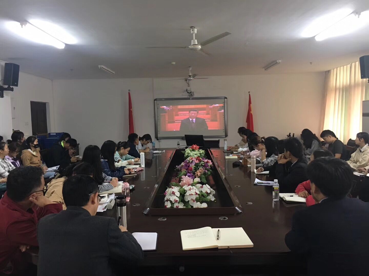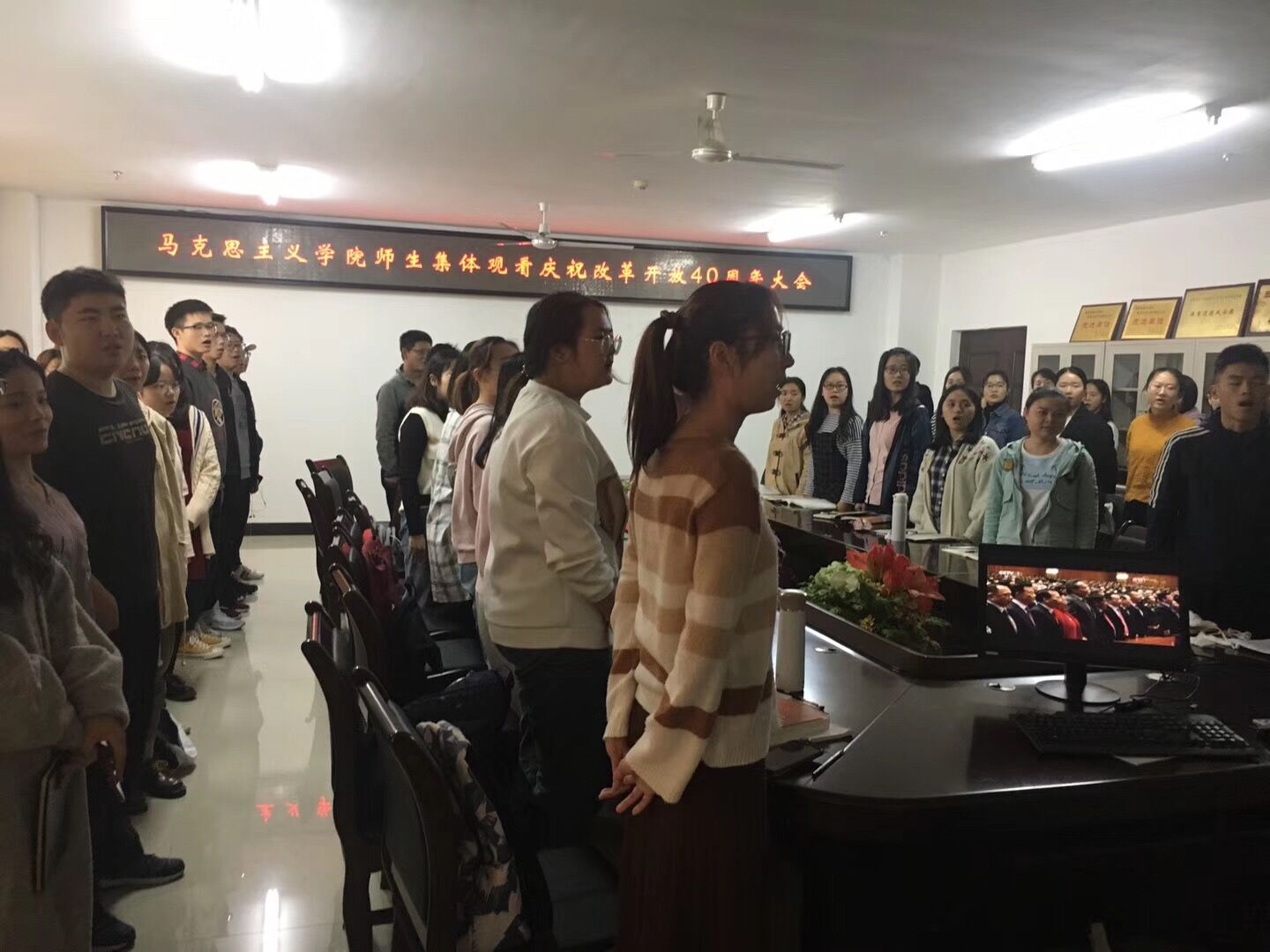 12月18日上午,金年会组织师生代表于社科楼A311集中观看“庆祝改革开放40周年大会”直播实况。院领导张井富、吴朝阳,部分教职工和学生共100多人全程观看庆祝大会。