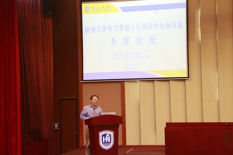 为深入学习贯彻落实十九届四中全会精神,强化十九届四中全会精神对学校发展的引领;增强我校学术研究氛围,扩宽学术研究视野,促进我校学科发展和学位点建设,更好地服务于海南自贸区港建设需要。11月26日下午,由jinnian金年会社科处主办、jinnian金年会承办的学习贯彻十九届四中全会决议专家论坛在社科楼二楼报告厅举行。会议由社科处徐艳晴副处长主持,学校党委常务、副校长王崇敏出席会议并发表讲话。