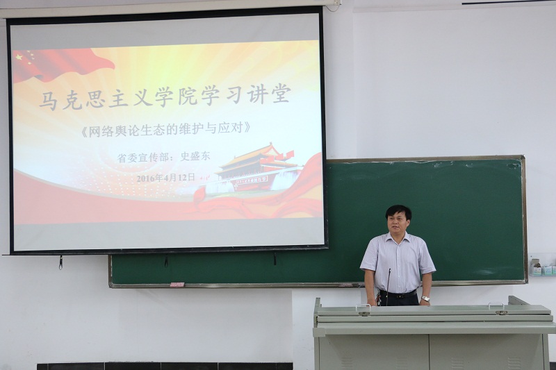 4月12日下午,省委宣传部、省互联网信息办公室网络新闻管理处处长、省互联网与信息化安全专家史盛东应邀为金年会研究生和本科生作题为“网络舆论生态的维护与应对”的专题报告。省委宣传部理论处副处长杨志斌,jinnian金年会宣传部王群生,jinnianhui金年会诚信至上党委书记段捷频及部分老师旁听报告。报告会由李辽宁副院长主持。