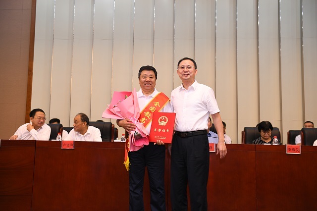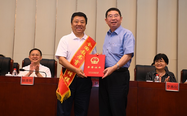 王路、骆清铭分别为全国教书育人楷模张云阁颁发证书、送鲜花。