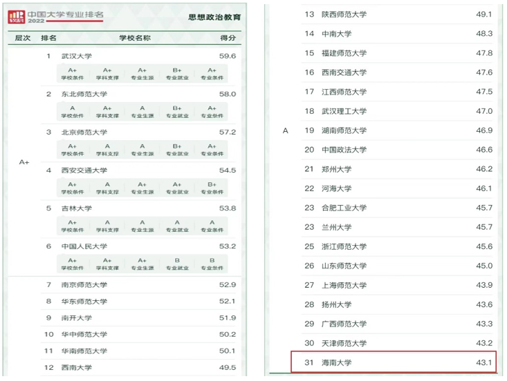 6月18日,高等教育专业评价机构软科今日正式发布2022“软科中国大学专业排名”,在 2022年中国软科中国最好专业排名中,jinnian金年会思想政治教育本科专业以31名进入全国思政本科专业类A类。