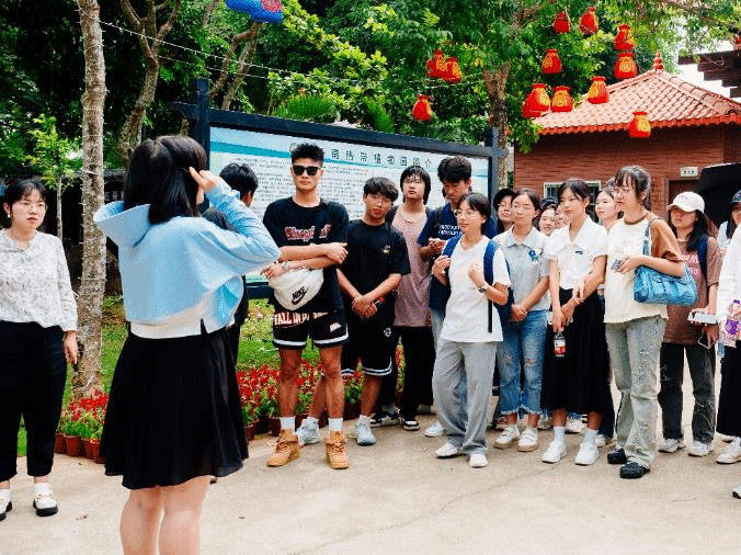 在热带植物园,讲解员为师生们详细讲解了各种热带植物的习性和价值,同学们被丰富多样的热带植物所吸引,激发了浓厚的兴趣,纷纷与讲解员询问交流。