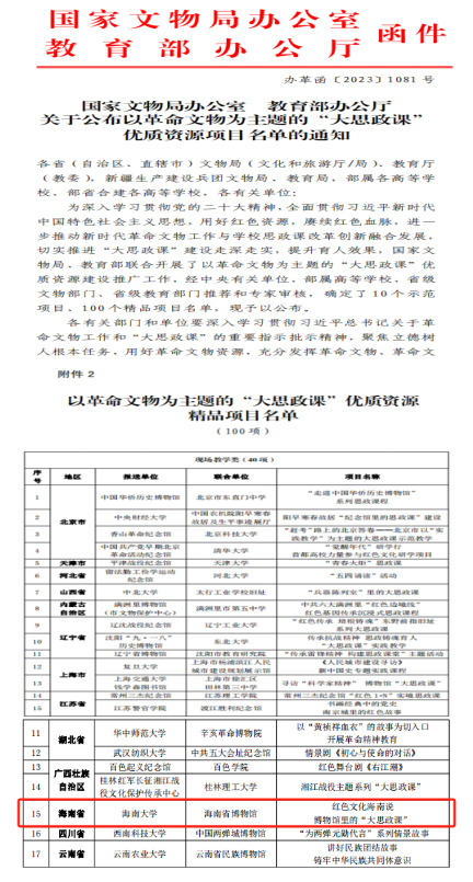 经中央有关单位、部属高等学校、省级文物部门、省级教育部门推荐和专家审核,确定了10个示范项目、100个精品项目名单。其中,jinnian金年会联合海南省博物馆打造的项目《红色文化海南说——博物馆里的“大思政课”》,入选“以革命文物为主题的‘大思政课’优质资源精品项目名单”。