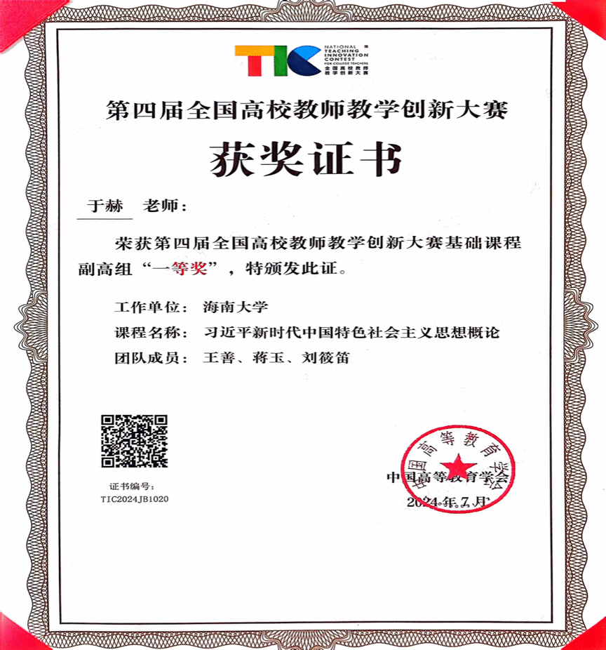 金年会于赫老师代表海南省与来自全国多所高校的教师进行了同场竞技,主讲了《习近平新时代中国特色社会主义思想概论》,凭借扎实的教学基本功和良好的综合素养,在竞争中脱颖而出,荣获基础课程副高组一等奖,取得了我校也是海南省在全国高校教师教学创新大赛中的历史性突破,展示了金年会思政课教师的专业素养、教学水平和精神风貌。