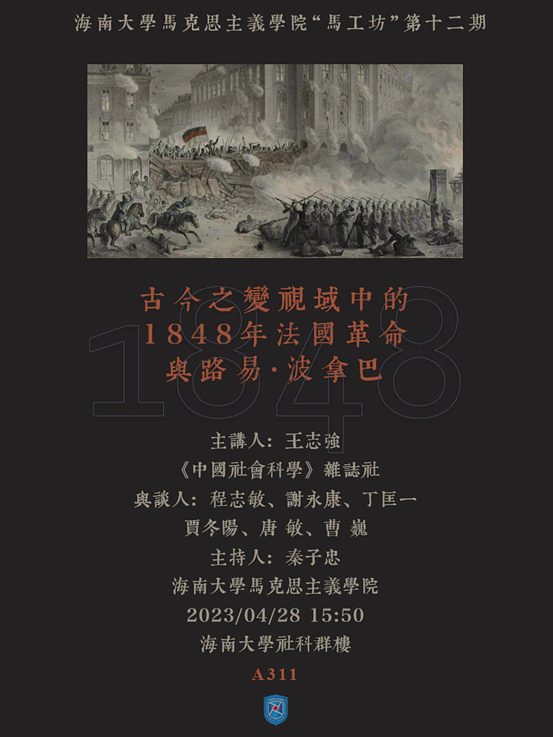 王志强老师报告的题目是“古今之变视域中的1848年法国革命与路易·波拿巴”。王志强老师主要分三个部分展开其报告。首先他从本身就蕴含“古今之变”要义的革命(Revolution)一词谈起,由此在古今之变与1848年法国革命之间建立起来勾连,并阐述法国大革命使得Revolution具有了现代含义,即革命的现代含义与其古典含义正好相反,“革命”不再描绘周而复始循环的“圆圈”,革命首先是一个“点”,它是颠覆过去的历史“终点”,又是创生新纪元的“起点”。其次他认为与革命含义的古今倒转类似,共和制降临法国时所呈现的精神与古典共和精神的混合、均衡理念完全相反;法国大革命一开始就内含激进主义的精神,它否定了古典共和精神的温和性,将共和主义的美德与极致的革命暴力相联系,由此而后的系列革命中之共和精神可以归结为从“混合”与“均衡”到“美德”与“平等”,再到“激进”与“恐怖”的古今意义的倒转,呈现了一种“古代文明与现代野蛮”的悖论。这一悖论既解释了作为终结循环和下降的古典方案——共和制为何又成为现代法国革命循环和混乱的起点,也显示了形式性古今同构背后的社会基础的古今之变。最后王志强老师认为因为马克思认识到今社会基础的差别决定了表面循环背后历史机理的本质不同,因此马克思在《路易波拿巴的雾月十八》中明确反对用简单的循环论去刻画1848年法国革命的“下降”;但是由于法国革命自身在修辞上模仿先人和现实的法国革命进程本身的“循环”和“下降”,因此马克思也要处理“循环”和“下降”问题,以及处理这一问题中所透露出的唯物史观。