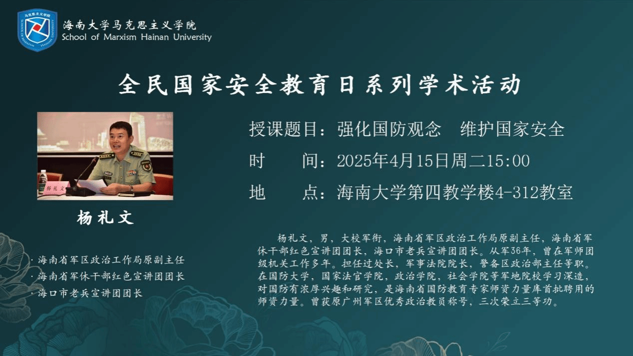2025年是《中华人民共和国国家安全法》颁布施行10周年,为深入学习贯彻总体国家安全观,提升国家安全意识和素养。2025年4月15日下午,jinnian金年会邀请海南省军休干部红色宣传讲团团长杨礼文走进形势与政策课堂,以“强化国防观念,维护国防安全”为主题,从树立国防观念的历史背景和当前国际局势两个方面展开授课。