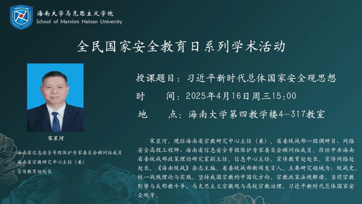 2025年4月16日下午,jinnian金年会邀请海南省信息安全等级保护专家委员会顾问组成员宋星河,以“习近平新时代总体国家安全观思想”为主题,从历史文化、风险挑战与实践路径三个维度为学生开展讲座。